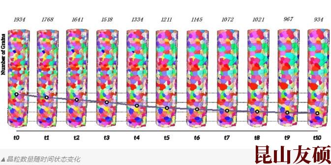 同时具有高时间分辨率和空间分辨率的三维实验数据是验证材料现象计算模型的关键。文章在现有的Al-Cu模型体系上跟踪退火过程晶粒结构的演变,为粉末压坯在烧结后期的晶粒重新排列、致密化和晶粒粗化提供了参考。该研究表明,Al-5%Cu合金经过十次退火后,初始组织由1934个晶粒减少到934个晶粒,而平均晶粒尺寸由194µm增大到247µm。
